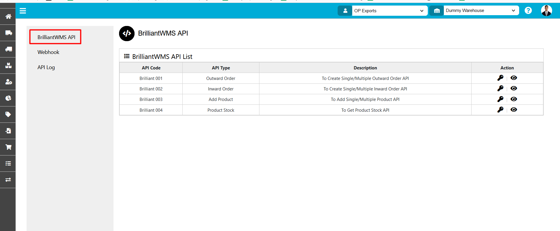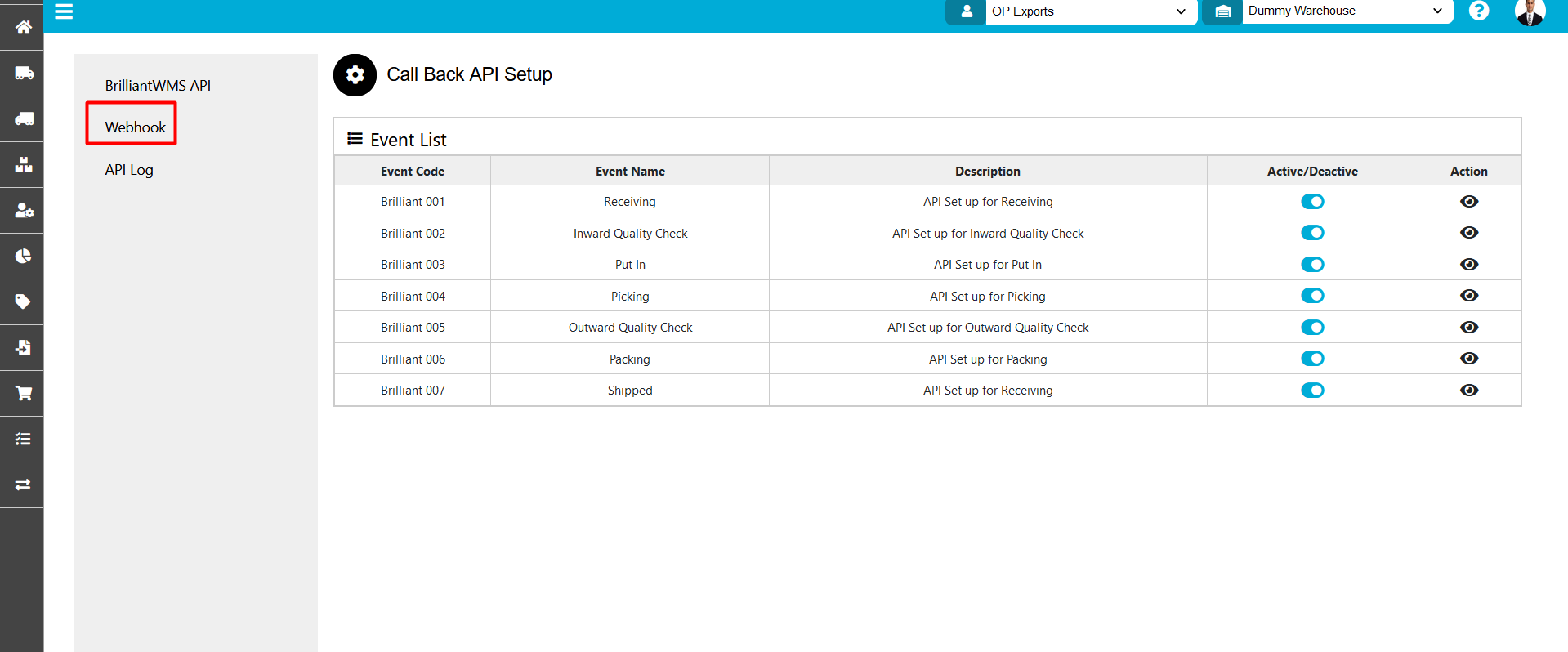 - Below Shown are the Call back API setup. User can Click on the Action Eye against the EVENT name.