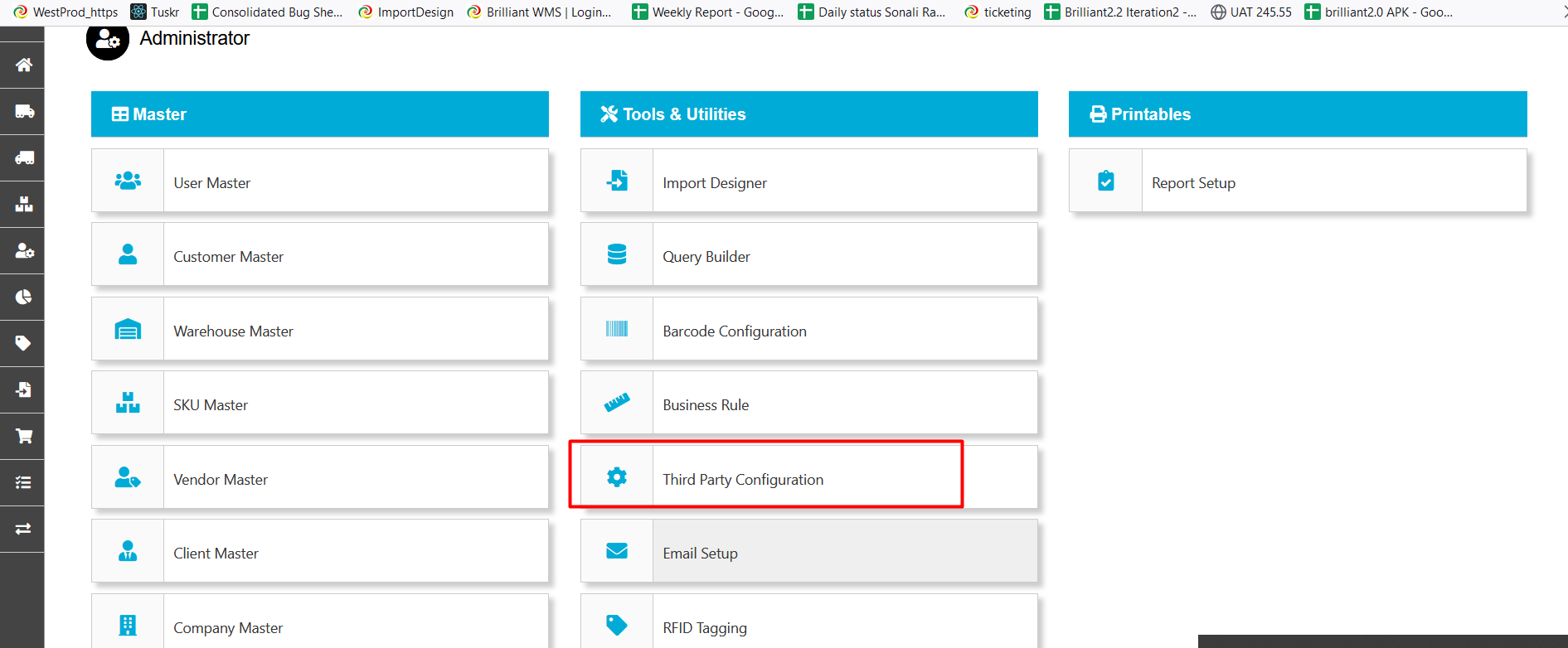 - We have provided the option for third Party Configuration in the Administrator Menu In tools and Utilites as shown below. Kindly refer the below Screens for Third Party configuration.