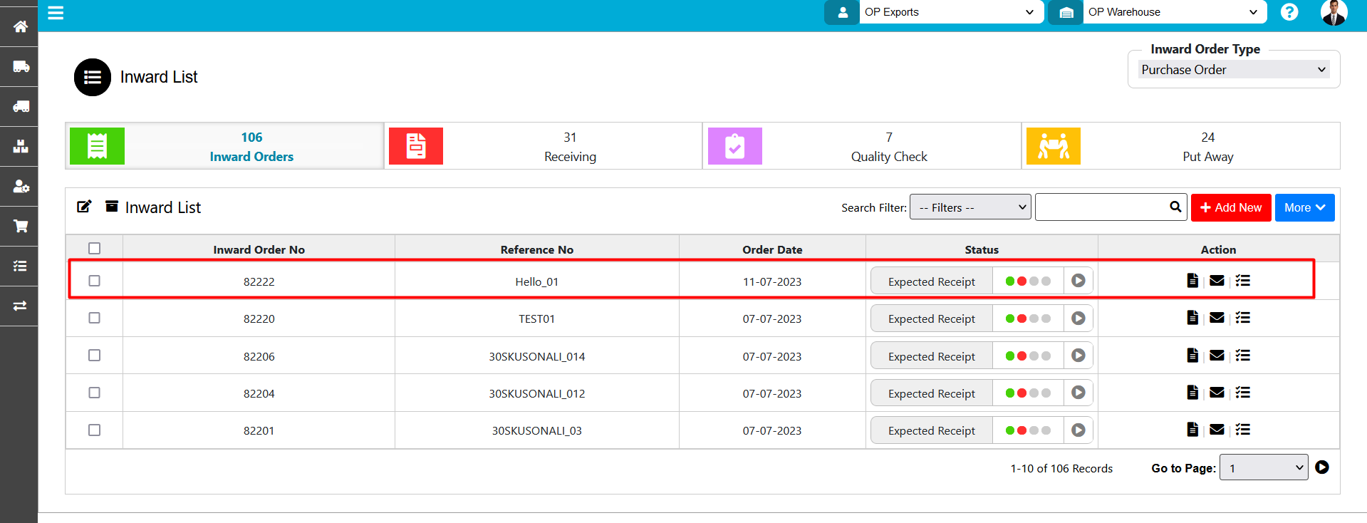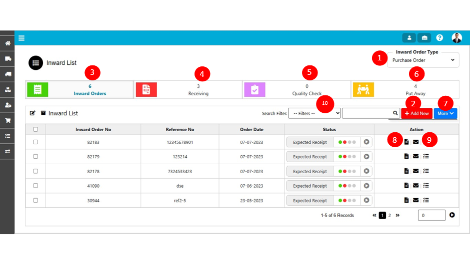 - Search Filter: By using the filter user is able to sort the order as per mentioned filter type of Inward order no, Reference No & order date.