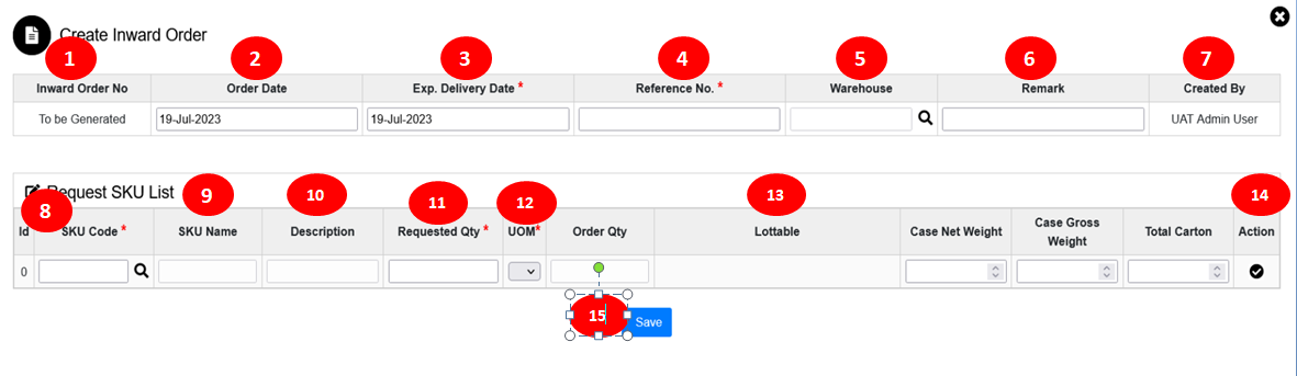 - Inward Order No: After filling all details regarding the inward order & clicking on the final save button system will generate the order No which will display on the inward list for the further process.