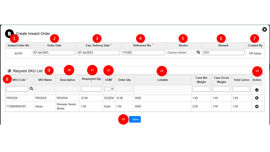 After Filling all the fields of creating order click on the save button then the order no will generate & the order will display on the inward list.
