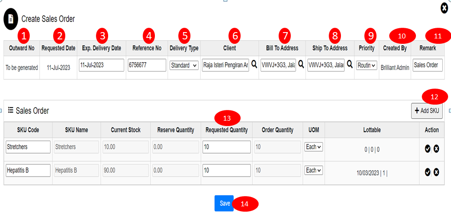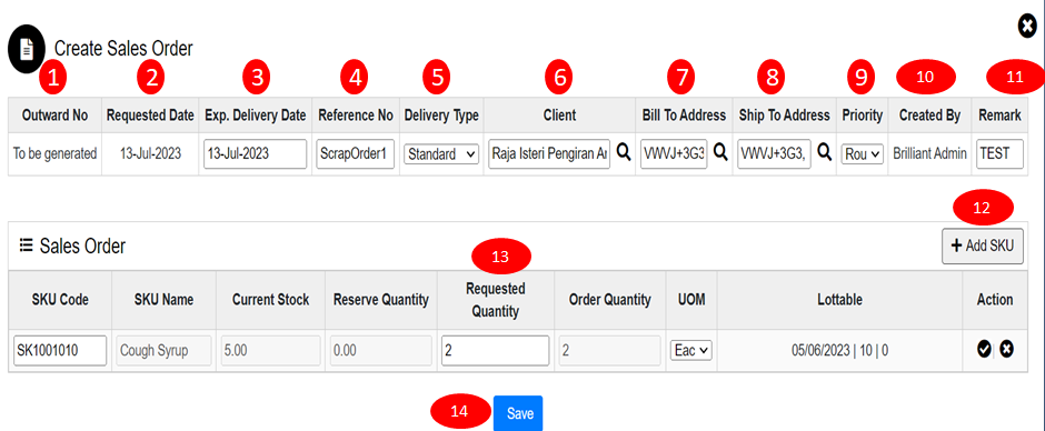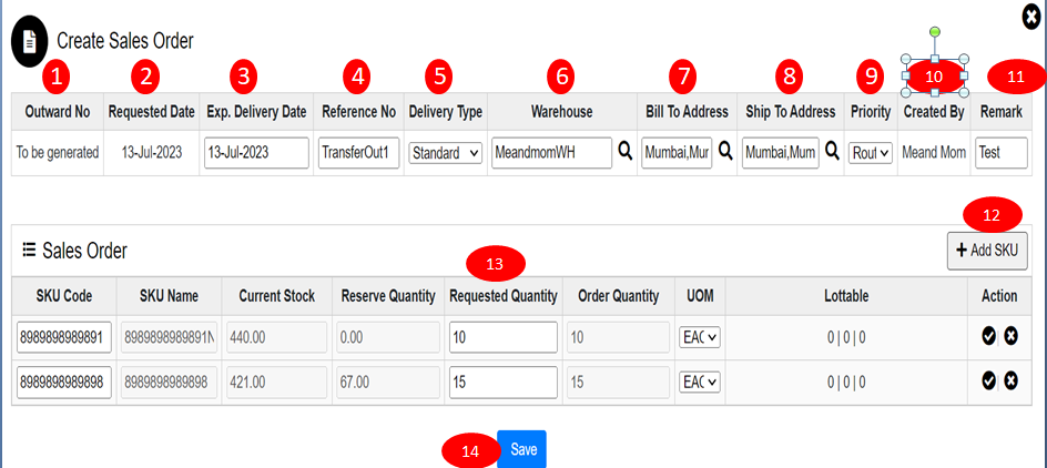- Outward No: After saving the Sales order system will generate a order no i.e outward order number.