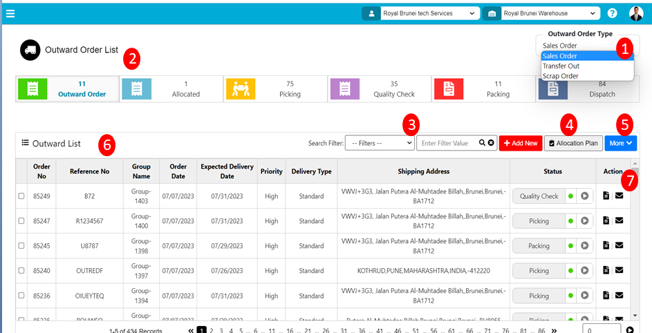 - Order status count display: Outward Order, Allocated, Picking, Quality Check, Packing, Dispatch