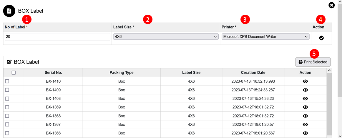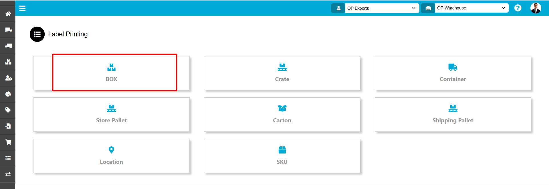 For printing the box label, User need to click on label menu & the label printing menu will open then click on the box tab.
