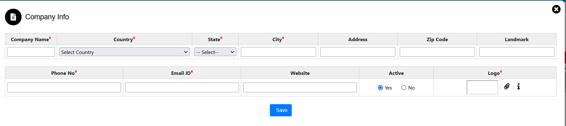 - Add New: To add the new Company details. User need to fill all mandatory field as shown below image & click on save button then company will be added successfully.