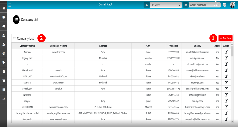 - Company List: After saving company user will able to see all details in Company list which contains Company Name, Company website, Address, City, Phone No, Email Id, Active, and Action.