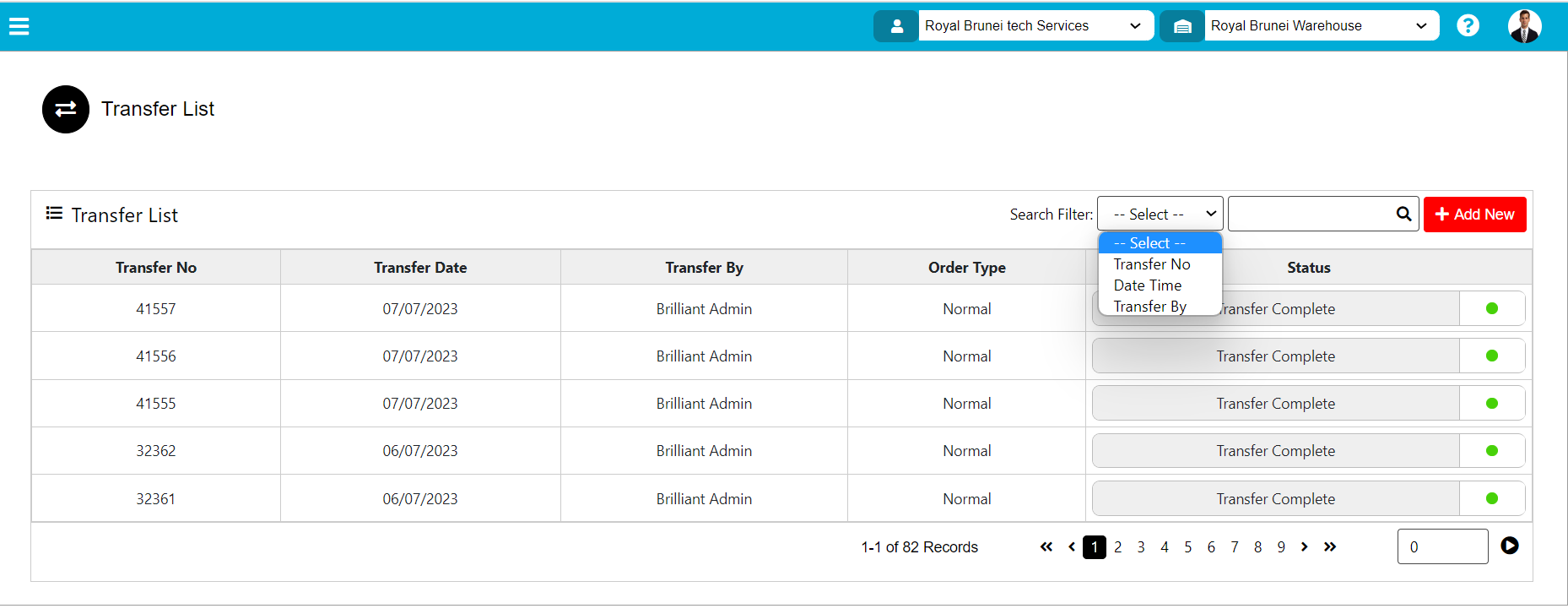 - Search Filter: Search filter used to search data by Transfer No, Transfer Date, and Transfer By.