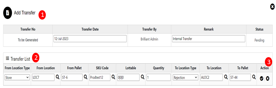 - Transfer List: In Transfer List display From Location Type, From Location, From Pallet, SKU Code, LOTTABLE, Quantity, To Location Type, To Location, and To Pallet.