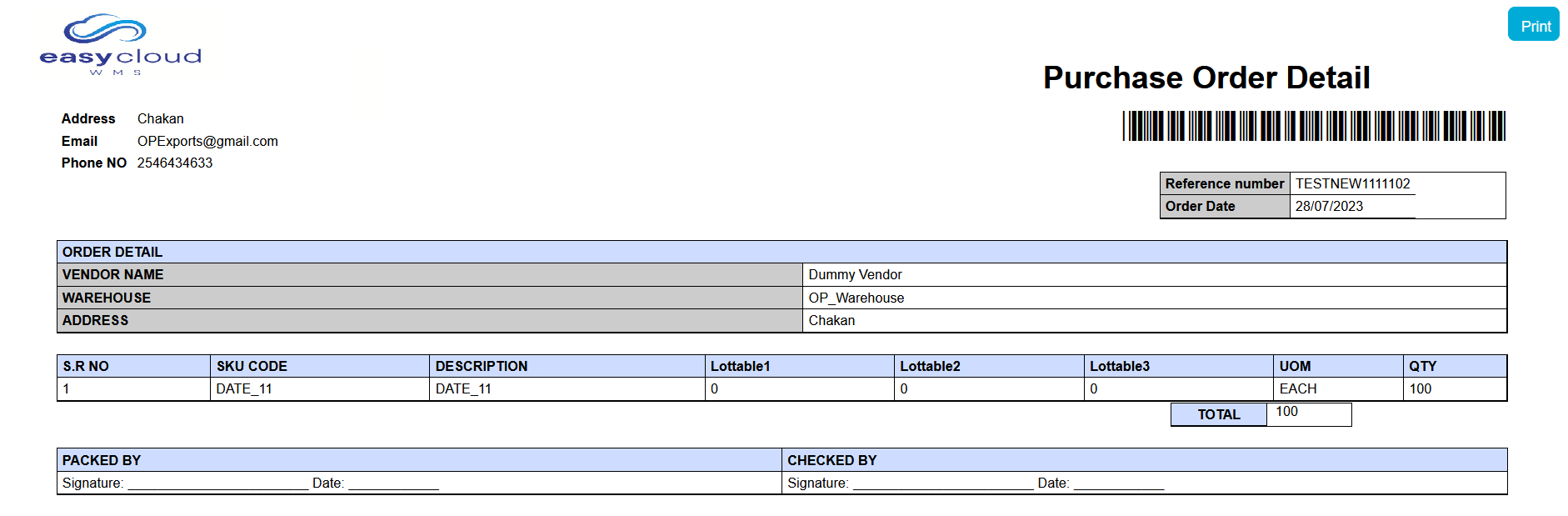 - Here is the Purchase order detail report in which more information on the single order system will show with details of LOTTABLE, SKU code, UOM, Qty.