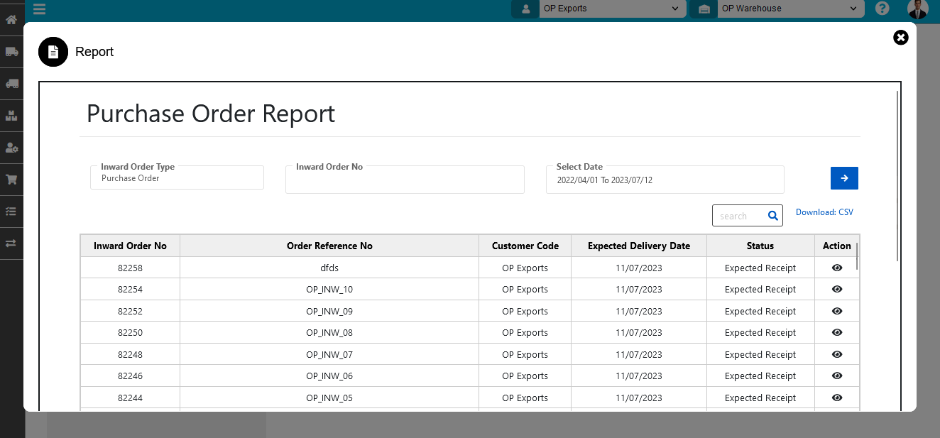 - Here is a Purchase order report in which all inward orders from during a certain time frame system can show. You can able to assign filters here like from date to date.