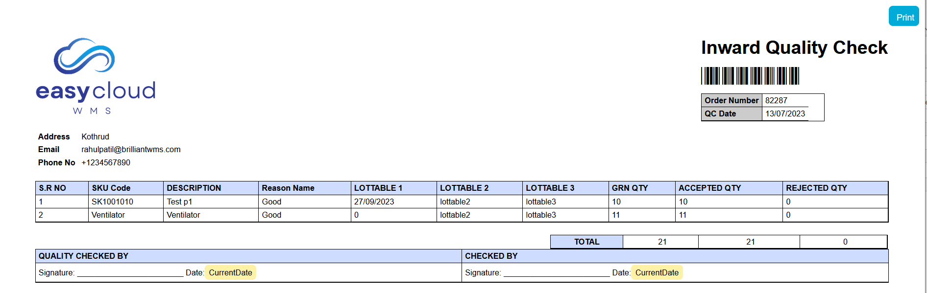 - Here is the Quality check report in which more information on the single order system is shown. GRN Qty, SKU code, UOM, and Accepted Qty, Rejected Qty is shown