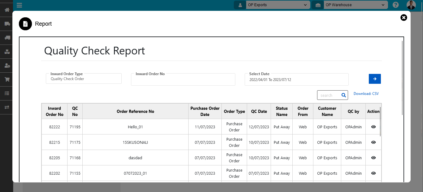 - If we want more information about any particular Quality Check order then just click on the view symbol in front of that record under the Action column.