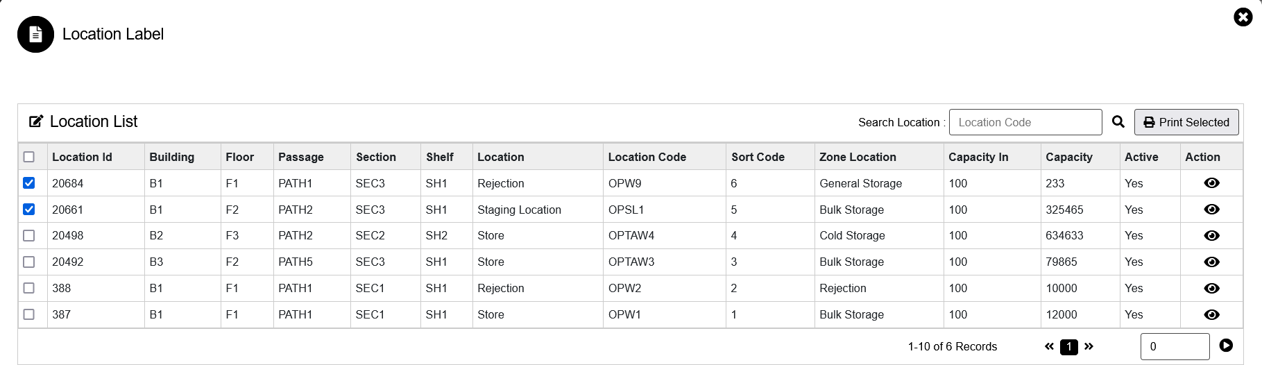 1. If user want to print label then need to select the location by clicking on check box & click on the print selected menu.