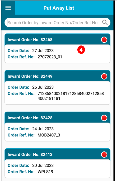 4.User need to select order from the list for completing put away process & after selecting the order, system will display the put away detail page.