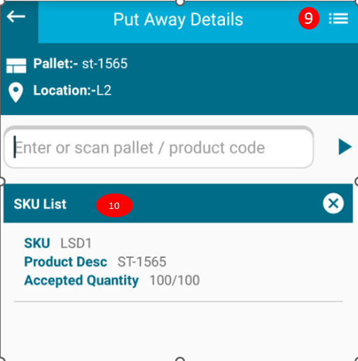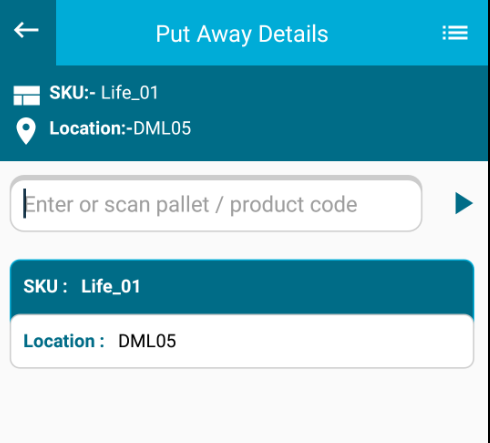 8. After scanning location,pallet & SKU system will display all details on put away details page.