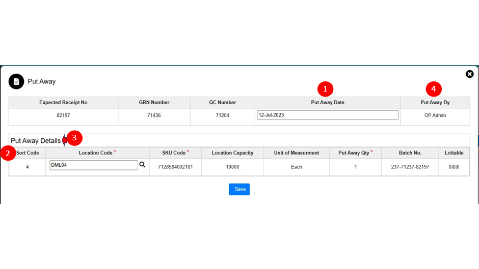 - Put away Details: In the put away details system will display the SKU details along with the location code. The location will be an editable field. if the user wants to edit the field, he can edit by clicking on the search button and then selecting another location.