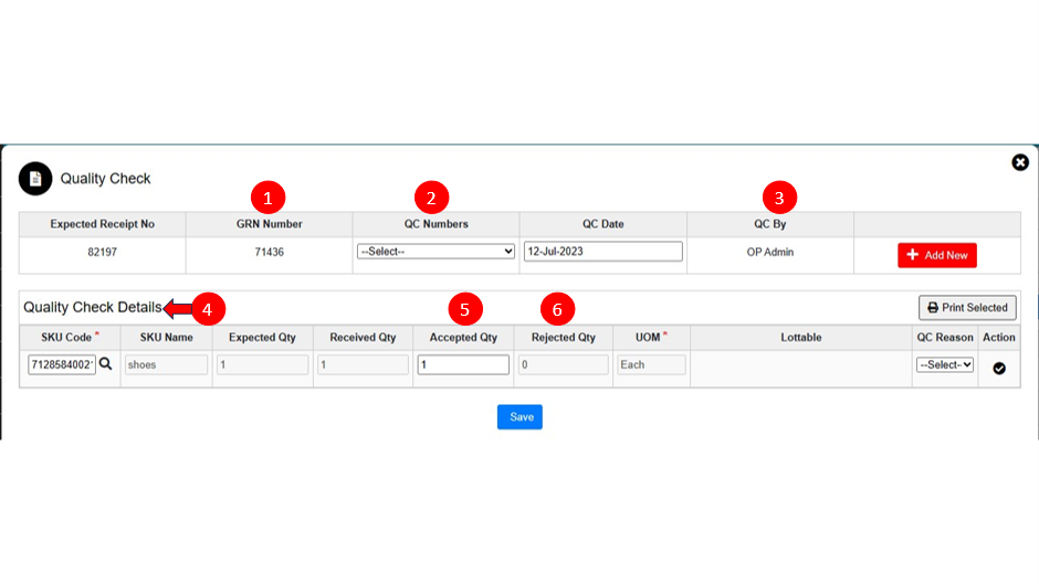 - Quality check details: in this field after selecting SKU from the list SKU details will bind as per field requirement.