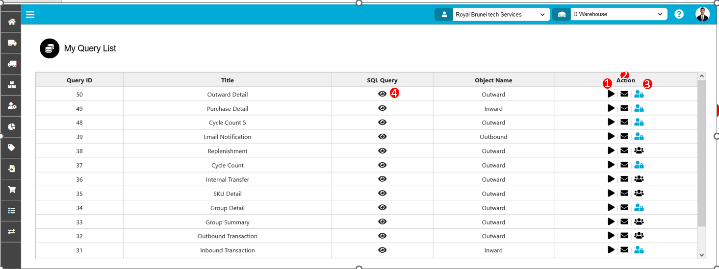 7.Warehouse : After selecting warehouse & executing the query system will display the result related to warehouse.