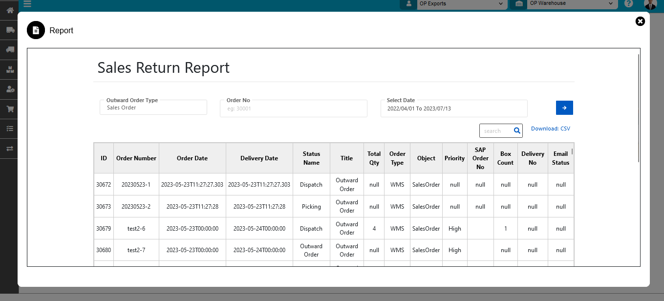 - Here is the Sales Return report in which all Dispatched orders marked as returned during a certain time frame will be displayed. You can able to assign filters here like from date to date.