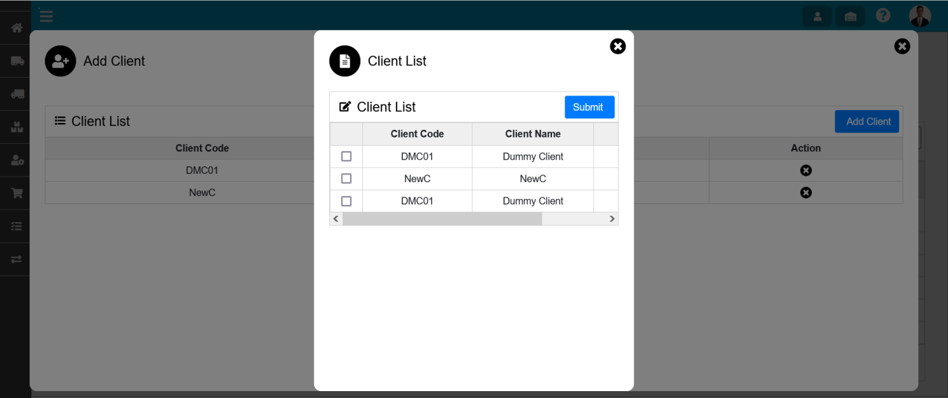 To add the Client, Click on Add Client icon.This will open the Client List wizard dialog. Select the Customer and click on Submit Button.