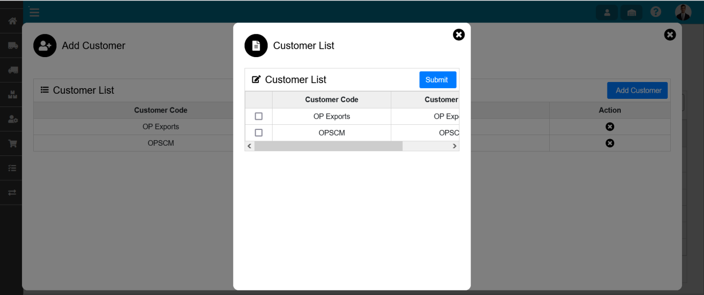 To add the Customer, Click on Add Customer This will open the Customer List wizard dialog. Select the Customer and click on Submit Button.