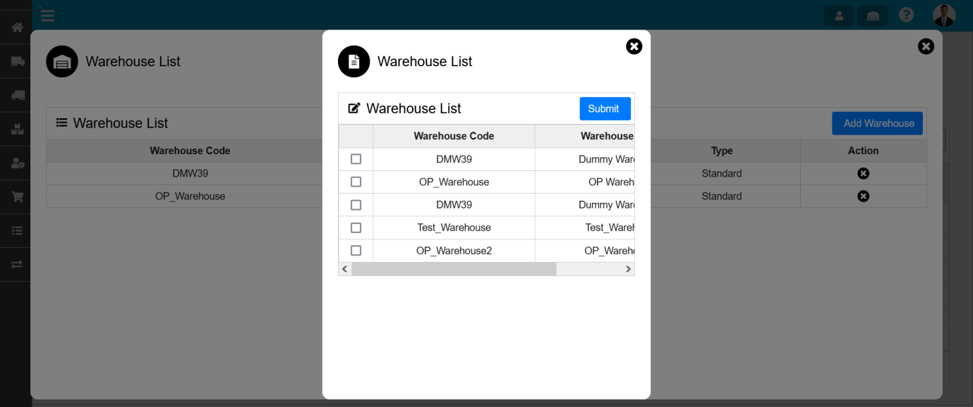 - Add Warehouse: User can assign warehouse.For assigning warehouse user need to click on add warehouse from list & need to select the warehouse & click on submit button then the warehouse will display in the warehouse list.