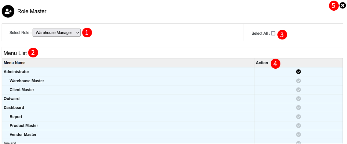 - Role Master: User can assign the role to user from the drop-down as Admin,warehouse manager.As per selected role user should select the menus from list by clicking on action button.