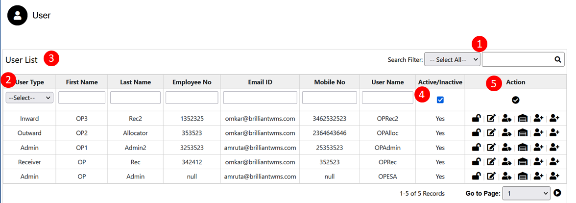 - Search Filter: Search User by User Type, First Name, Last Name, Employee No., Email ID, Mobile No., User Name.