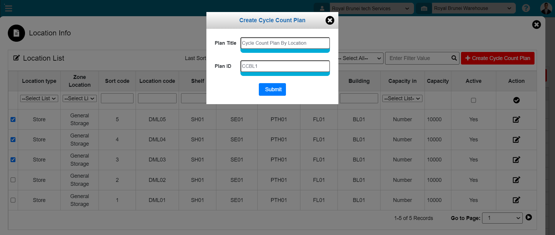 - Submit. When click on Submit Cycle Count Plan for location will be created.