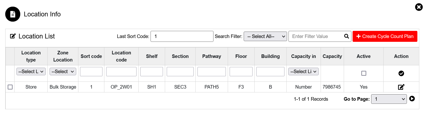 - Search Filter: Search location by Location type, Zone location, Sort code, Location code, Shelf, Section, Pathway, Floor, and Building.