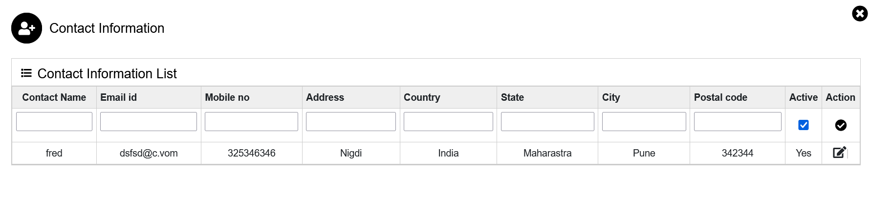 To add the contact information Click on contact icon which is in action column. It will open contact information list wizard dialog.