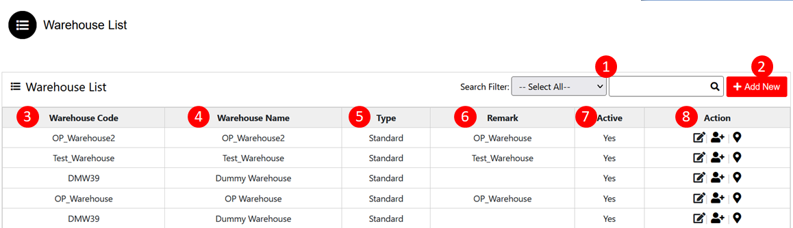 - Search Filter: Search User by Warehouse Name, warehouse Code, Type.